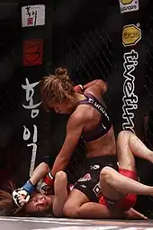 While mixed martial arts is primarily a male dominated sport, it does have female athletes.[1][2][3] For instance, Female competition in Japan includes promotions such as DEEP Jewels. Now defunct promotions that featured female fighters were Valkyrie, and Smackgirl.[4] Professional mixed martial arts organizations in the United States that invite women to compete are industry leader Ultimate Fighting Championship, the all female Invicta Fighting Championships, Resurrection Fighting Alliance, Bellator Fighting Championships, and Legacy Fighting Championship. Now defunct promotions that featured female fighters were Strikeforce and EliteXC.[5] There has been a growing awareness of women in mixed martial arts due to popular female fighters and personalities such as Amanda Nunes, Megumi Fujii, Gina Carano, Cristiane "Cyborg" Santos, Ronda Rousey, Miesha Tate, Holly Holm and Joanna Jędrzejczyk and among others.[6] Carano became known as "the face of women's MMA" after appearing in a number of EliteXC events.[7][8][9] This was furthered by her appearances on MGM Television's 2008 revival of their game show American Gladiators.[10][11][12][13]