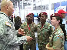 Female South African National Defence Force members speak with an American soldier during the Africa Aerospace and Defence expo in 2010.