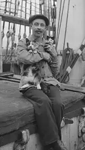 Since the late 18th century, merchant seamen and dockworkers have worn denim flared trousers, striped undershirts, knitted roll neck jumpers, and short blue peacoats.[11] This basic outfit, paired with a thick leather belt, flat cap and clogs, was also a mark of identification for turn of the century criminal gangs such as the Scuttlers.[12] On the more luxurious cruise ships and ocean liners, deckhands wore neatly pressed dress blues similar to those of the Royal Navy and USN, while waiters and cabin stewards wore white uniforms with a band collar, gilded brass buttons, and a gold stripe on the trouser leg. In wet weather, sailors wore oilskins and Souwesters, but contemporary fishermen generally wear a two piece yellow or orange waterproof jacket and trousers. Modern updates to the traditional look include polar fleeces, hoodies, baseball caps, and knit caps. Straw hats, sailor caps and tarred waterproof hats are no longer in widespread civilian use, but wool or denim versions of the Greek fisherman's cap remain common.