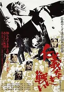 Many Japanese movie critics cite the retirement of Junko Fuji in 1972 as marking the decline of the ninkyo eiga.[13] Just as moviegoers were getting tired of the ninkyo films, a new breed of yakuza films emerged, the jitsuroku eiga (実録映画, "actual record films"). These films portrayed post-war yakuza not as honorable heirs to the samurai code, but as ruthless, treacherous street thugs living for their own desires. Many jitsuroku eiga were based on true stories, and filmed in a documentary style with shaky camera. The Jitsuroku genre was popularized by Kinji Fukasaku's groundbreaking 1973 yakuza epic Battles Without Honor and Humanity.[7] Based on the events of real-life yakuza turfs in Hiroshima Prefecture, the film starring Bunta Sugawara spawned four sequels and another three part series.
