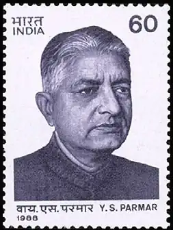 Yashwant Singh Parmar (4 August 1906 – 2 May 1981) was an Indian politician. He was a leader of the Indian National Congress and the first Chief Minister of Himachal Pradesh state. Upon the formation of the constituent assembly of India in 1946, he represented Himachal Pradesh in the constituent assembly. For his key role in the formation of the Himachal Pradesh state, from the 1940s until 1977, Parmar is hailed as the architect, the founder, or the creator of the Himachal Pradesh state. In Hindi, he is widely referred to as 'Himachal Nirmata' (the creator of Himachal').[1][2][3][4][5]
