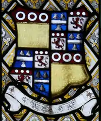 • Robert Giffard (son), who married Radigand (Latinized to Radigunda) Dennis, daughter and sole heiress of Gilbert Dennis of Gidicott (about 9 miles south of Yeo) in the parish of Bradford,[15] Devon, and lord of the manor of Bradford.[16] Gilbert Dennis was the eldest son of Thomas Dennis (by his first wife Alice Bamfield) of Holcombe Burnell in South Devon, himself the son of Walter Dennis of Gidicott. The Dennis family is first recorded in Devon in the 12th century,[17] one branch at Orleigh, about 1 mile south of Yeo, and the other at Gidicott. Both branches had armorials containing three Danish battle-axes, supposedly referring to their Danish origins. The arms of Dennis of Orleigh Azure, three Danish battle-axes or[18] survive in a fragment of ancient stained glass in the Yeo Vale Chapel forming the north transept of Alwington Church. The arms of the Dennis family of Gidicott (whose ancestors were the Giffards of Halsbury[19]) and later of Holcombe Burnell were: Ermine, three Danish battle axes gules.[19]