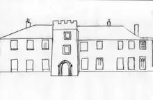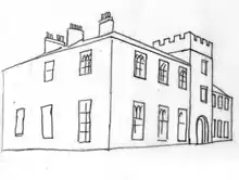Yeo Vale House, south front, drawing from photograph of derelict house circa 1960. The rubble-stone built crenellated entrance tower is mediaeval, the stucco facade behind is Georgian (18th century)