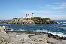 A number of spots throughout The Yorks have views of the Cape Neddick Light at Nubble Rock, which has figured in both artists' work and souvenirs of the Maine coast. A photo of the Cape Neddick Light is on the Voyager 1 spacecraft labeled as Seashore, Maine.[9] Visible in clear weather is the 133-foot (41-meter) tall Boon Island Light on Boon Island, located 6.2 miles (10.0 km) off York.