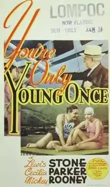 You're Only Young Once is a 1937 American comedy film directed by George B. Seitz. Following A Family Affair, it is the second film of the Andy Hardy series. Lewis Stone replaces Lionel Barrymore as Judge Hardy while Fay Holden replaced Spring Byington as his wife since both Barrymore and Byington were too expensive for the sequel's modest budget. Mickey Rooney would repeat his role as Andy while Cecilia Parker, as his sister, and Sara Haden, as Aunt Milly, would also reprise their roles from the original film. They were the only original actors transferred to the series.[1]