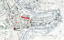 Zeughausgasse was originally called vor den Predigern after the nearby Prediger Abbey. The Dominican abbey was built throughout the 13th and 14th centuries. In 1527 the abbey was secularized and the street changed names to Beim Totentanz after a Dance of Death painting cycle by Niklaus Manuels on the abbey wall.[1] The 107.5 m (353 ft) long wall was painted with the fresco in 1520 which remained until the demolition of the wall in 1660.[2] Even though the painting was destroyed in the 17th century, the street remained Beim Totentanz until the 18th century. In 1745 it was renamed Zeughausgasse and widened. The Zeughaus or armory, that the street was named after, had originally been a workhouse for the abbey and occupied what would become Zeughausgasse 18-28, Nägeligasse 4-6 and 7-13. In 1876 the old armory was demolished[3] and in 1880 the street was widened.
