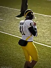 As a senior, Meskó once punted a ball 70 yards in the air.[23] As a senior punter and placekicker, Meskó was a part of the focus of opposition game plans.[24] He averaged 44 yards per punt as a senior and dropped 16 inside the 10-yard line according to The Plain Dealer and 15 inside the 15-yard line according to the Ann Arbor News.[12][25] He was selected to play on 15 January 2005 U.S. Army All-American Bowl as a punter.[26] During the game, he drew a roughing the kicker penalty and posted seven punts including kicks of 56, 48 and 47 yards and a pooch punt that he placed inside the 15-yard line.[27] He was named an Associated Press Division II All-Ohio first-team punter.[28] He was also selected to numerous local area All-star teams as both a punter and a placekicker. He served as both punter and kicker for the Ohio team during the 2005 Big 33 Football Classic in which he was 4 for 5 on PATs.[29][30] He was recognized as the 2004 Northeast Inland All-District Division II first team punter by the media.[31] He was selected as the All-Akron Beacon Journal team placekicker and the all-Summit County punter.[32][33] The Akron area coaches selected him as both the punter and kicker for the All-Western Reserve Conference, North Division first-team.[34] He was selected to the combined Summit-Medina-Portage Counties All-Area team as the first team punter by The Plain Dealer.[35] He was the first team punter for The Plain Dealer All-area team.[36] Although Meskó's high school required 40 hours of community service, he performed over 300 hours.[12]