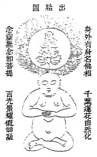 Twofold Mystery thus envisions the mystical process in two steps, described as double forgetting (jianwang 兼忘). Practitioners must first discard all concepts of being, then proceed to discard all ideas of nonbeing. These two are, moreover, identified as mental projections (jing 境), i.e., illusory mental imaginations that are projected outward and create an apparent reality of "being;" and active wisdom (zhi 智) or mind as such (xin 心), the inherent function of active consciousness which signifies "nonbeing".[46] "Forgetting" both means the reorganization of ordinary consciousness to absolute consciousness and again from absolute consciousness to no consciousness at all in complete oblivion. Yet the sagely state is not nothingness but the "embodiment of the Dao of Middle Oneness," a state of radiance and surging activity.[47]