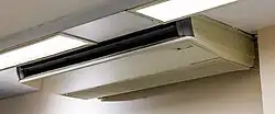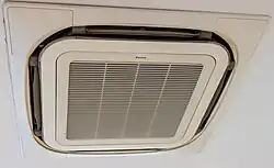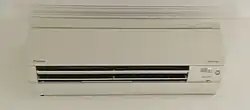 The first mini-split system was sold in 1961 by Toshiba in Japan, and the first wall-mounted mini-split air conditioner was sold in 1968 in Japan by Mitsubishi Electric, where small home sizes motivated their development. The Mitsubishi model was the first air conditioner with a cross-flow fan.[64][65][66] In 1969, the first mini-split air conditioner was sold in the US.[67] Multi-zone ductless systems were invented by Daikin in 1973, and variable refrigerant flow systems (which can be thought of as larger multi-split systems) were also invented by Daikin in 1982. Both were first sold in Japan.[68] Variable refrigerant flow systems when compared with central plant cooling from an air handler, eliminate the need for large cool air ducts, air handlers, and chillers; instead cool refrigerant is transported through much smaller pipes to the indoor units in the spaces to be conditioned, thus allowing for less space above dropped ceilings and a lower structural impact, while also allowing for more individual and independent temperature control of spaces. The outdoor and indoor units can be spread across the building.[69] Variable refrigerant flow indoor units can also be turned off individually in unused spaces. The lower start-up power of VRF's DC inverter compressors and their inherent DC power requirements also allow VRF solar-powered heat pumps to be run using DC-providing solar panels.