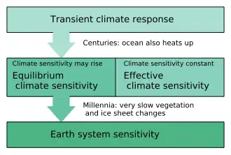 By definition, equilibrium climate sensitivity does not include feedbacks that take millennia to emerge, such as long-term changes in Earth's albedo because of changes in ice sheets and vegetation. It includes the slow response of the deep oceans' warming, which also takes millennia, and so ECS fails to reflect the actual future warming that would occur if CO2 is stabilized at double pre-industrial values.[40] Earth system sensitivity (ESS) incorporates the effects of these slower feedback loops, such as the change in Earth's albedo from the melting of large continental ice sheets, which covered much of the Northern Hemisphere during the Last Glacial Maximum and still cover Greenland and Antarctica). Changes in albedo as a result of changes in vegetation, as well as changes in ocean circulation, are also included.[41][42] The longer-term feedback loops make the ESS larger than the ECS, possibly twice as large. Data from the geological history of Earth is used in estimating ESS. Differences between modern and long-ago climatic conditions mean that estimates of the future ESS are highly uncertain.[43] Unlike ECS and TCR, the carbon cycle is not included in the definition of the ESS, but all other elements of the climate system are included.[44]