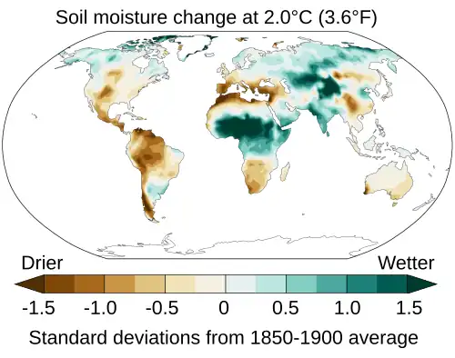 Higher temperatures increase evaporation. This dries the soil and increases plant stress. Agriculture suffers as a result. This means even regions where overall rainfall is expected to remain relatively stable will experience these impacts.[52]: 1157 These regions include central and northern Europe. Without climate change mitigation, around one third of land areas are likely to experience moderate or more severe drought by 2100.[52]: 1157 Due to global warming droughts are more frequent and intense than in the past.[53]