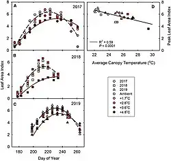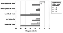 - ↑ Zhao, Chuang; Liu, Bing; Piao, Shilong; Wang, Xuhui; Lobell, David B.; Huang, Yao; et al. (15 August 2017). "Temperature increase reduces global yields of major crops in four independent estimates". Proceedings of the National Academy of Sciences of the United States of America. 114 (35): 9326–9331. Bibcode:2017PNAS..114.9326Z. doi:10.1073/pnas.1701762114. PMC 5584412. PMID 28811375.