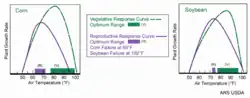Changes in temperature and weather patterns will alter areas suitable for farming.[30] The current prediction is that temperatures will increase and precipitation will decrease in arid and semi-arid regions (Middle East, Africa, Australia, Southwest United States, and Southern Europe).[30][31] In addition, crop yields in tropical regions will be negatively affected by the projected moderate increase in temperature (1–2 °C) expected to occur during the first half of the century.[21] During the second half of the century, further warming is projected to decrease crop yields in all regions including Canada and the Northern United States.[31] Many staple crops are extremely sensitive to heat and when temperatures rise over 36 °C (97 °F), soybean seedlings are killed and corn pollen loses its vitality.[32][33] According to some estimates, a 1 °C increase in global temperature could result in a 5–10% decline in crop yields in the future.[34]