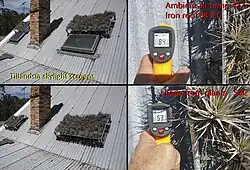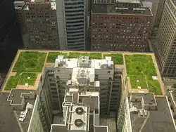 A concentration of green roofs in an urban area can reduce the city's average temperatures during the summer, combating the urban heat island effect.[15] Traditional building materials soak up the sun's radiation and re-emit it as heat, making cities at least 4 °C (7.2 °F) hotter than surrounding areas. On Chicago's City Hall, by contrast, which features a green roof, roof temperatures on a hot day are typically 1.4–4.4 °C (2.5–7.9 °F) cooler than they are on traditionally roofed buildings nearby.[16] Green roofs are becoming common in Chicago, as well as in Atlanta, Portland, and other United States cities, where their use is encouraged by regulations to combat the urban heat-island effect. Green roofs are a type of low impact development.[17] A 2023 meta-analysis found that green roofs reduce rooftop surface temperatures by an average of 30 °C during summer months, providing significant mitigation of urban heat island effects.[18] In the case of Chicago, the city has passed codes offering incentives to builders who put green roofs on their buildings. The Chicago City Hall green roof is one of the earliest and most well-known examples of green roofs in the United States; it was planted as an experiment to determine the effects a green roof would have on the microclimate of the roof. Following this and other studies, it has now been estimated that if all the roofs in a major city were greened, urban temperatures could be reduced by as much as 7 °C (13 °F).[19]