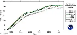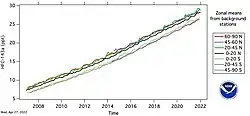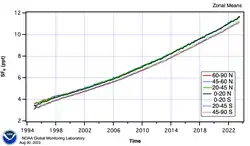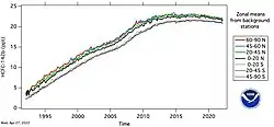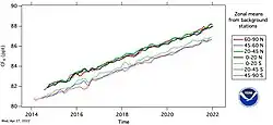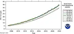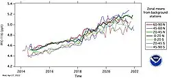 - ↑ "Long-term global trends of atmospheric trace gases". NOAA Earth System Research Laboratories. Retrieved 11 February 2021.