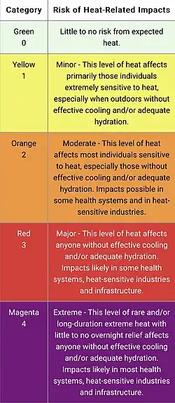 Prevention includes avoiding medications that can increase the risk of heat illness, gradual adjustment to heat, and sufficient fluids and electrolytes.[49][50]Exposure to extreme heat poses an acute health hazard, especially for people deemed as vulnerable.[51][52] Vulnerable people with regard to heat illnesses include people with low incomes, minority groups, women (in particular pregnant women), children, older adults (over 65 years old), people with chronic diseases, disabilities and multiple long-term health conditions.[51]: 13 Other people at risk include those living in urban environments (due to the urban heat island effect), outdoor workers and people who take certain prescription drugs.[51]