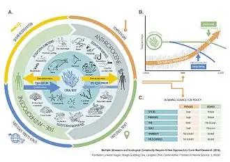A diagram showing the ecological processes of coral reefs before and during the Anthropocene