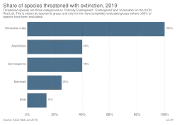 A 2023 study published in PLOS One shows that around two million species are threatened with extinction, double the estimate put forward in the 2019 IPBES report.[88] According to a 2023 study published in PNAS, at least 73 genera of animals have gone extinct since 1500. If humans had never existed, the study estimates it would have taken 18,000 years for the same genera to have disappeared naturally, leading the authors to conclude that "the current generic extinction rates are 35 times higher than expected background rates prevailing in the last million years under the absence of human impacts" and that human civilization is causing the "rapid mutilation of the tree of life."[89][90][91]