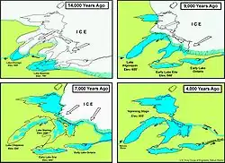 This Wisconsin glaciation left widespread impacts on the North American landscape. The Great Lakes and the Finger Lakes were carved by ice deepening old valleys. Most of the lakes in Minnesota and Wisconsin were gouged out by glaciers and later filled with glacial meltwaters. The old Teays River drainage system was radically altered and largely reshaped into the Ohio River drainage system. Other rivers were dammed and diverted to new channels, such as Niagara Falls, which formed a dramatic waterfall and gorge, when the waterflow encountered a limestone escarpment. Another similar waterfall, at the present Clark Reservation State Park near Syracuse, New York, is now dry.
