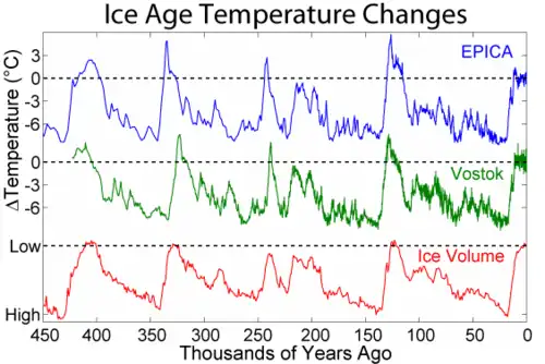- ↑ Augustin, L; Barbante, C; Barnes, PRF; Barnola, JM; Bigler, M; Castellano, E; Cattani, O; Chappellaz, J; et al. (2004-06-10). "Eight glacial cycles from an Antarctic ice core". Nature. 429 (6992): 623–8. Bibcode:2004Natur.429..623A. doi:10.1038/nature02599. PMID 15190344. S2CID 4342139.