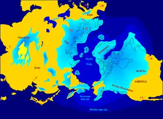 - 1 2 3 Ladant, Jean-Baptiste; Donnadieu, Yannick (2016-09-21). "Palaeogeographic regulation of glacial events during the Cretaceous supergreenhouse". Nature Communications. 7 (1): 12771. Bibcode:2016NatCo...712771L. doi:10.1038/ncomms12771. ISSN 2041-1723. PMC 5036002. PMID 27650167.