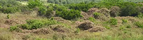 Invasive species are the subset of established non-native alien or naturalized species that are a threat to native species and biodiversity.[3] The term "invasive" is poorly defined and often very subjective.[4] Invasive species may be plants, animals, fungi, and microbes; some include native species that have invaded human habitats such as farms and landscapes.[5] Some broaden the term to include indigenous or "native" species that have colonized natural areas.[4] Some sources name Homo sapiens as an invasive species,[6][7] but broad appreciation of human learning capacity and their behavioral potential and plasticity may argue against any such fixed categorization.[8] The definition of "native" can also be controversial. For example, the ancestors of modern horses (Equus ferus) evolved in North America and radiated to Eurasia before becoming extinct in North America. Upon being introduced to North America in 1493 by Spanish conquistadors, it is debatable whether the feral horses were native or exotic to the continent of their evolutionary ancestors.[9]
