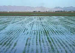 Negative impacts frequently accompany extensive irrigation.[36] Some projects which diverted surface water for irrigation dried up the water sources, which led to a more extreme regional climate.[37] Projects that relied on groundwater and pumped too much from underground aquifers created subsidence and salinization. Salinization of irrigation water in turn damaged the crops and seeped into drinking water.[37] Pests and pathogens also thrived in the irrigation canals or ponds full of still water, which created regional outbreaks of diseases like malaria and schistosomiasis.[38][39][40] Governments also used irrigation schemes to encourage migration, especially of more desirable populations into an area.[41][42][43] Additionally, some of these large nationwide schemes failed to pay off at all, costing more than any benefit gained from increased crop yields.[44][45]