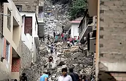 Slope material that becomes saturated with water may produce a debris flow or mud flow. However, also dry debris can exhibit flow-like movement.[30] Flowing debris or mud may pick up trees, houses and cars, and block bridges and rivers causing flooding along its path. This phenomenon is particularly hazardous in alpine areas, where narrow gorges and steep valleys are conducive of faster flows. Debris and mud flows may initiate on the slopes or result from the fluidization of landslide material as it gains speed or incorporates further debris and water along its path. River blockages as the flow reaches a main stream can generate temporary dams. As the impoundments fail, a domino effect may be created, with a remarkable growth in the volume of the flowing mass, and in its destructive power.