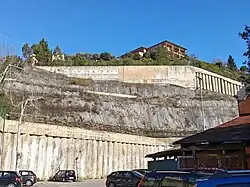 Hotel Panorama at Lake Garda. Part of a hill of Devonian shale was removed to make the road, forming a dip-slope. The upper block detached along a bedding plane and is sliding down the hill, forming a jumbled pile of rock at the toe of the slide.