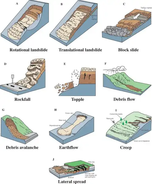 In traditional usage, the term landslide has at one time or another been used to cover almost all forms of mass movement of rocks and regolith at the Earth's surface. In 1978, geologist David Varnes noted this imprecise usage and proposed a new, much tighter scheme for the classification of mass movements and subsidence processes.[26] This scheme was later modified by Cruden and Varnes in 1996,[27] and refined by Hutchinson (1988),[28] Hungr et al. (2001),[29] and finally by Hungr, Leroueil and Picarelli (2014).[6] The classification resulting from the latest update is provided below.