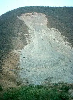 A debris slide is a type of slide characterized by the chaotic movement of material mixed with water and/or ice. It is usually triggered by the saturation of thickly vegetated slopes which results in an incoherent mixture of broken timber, smaller vegetation and other debris.[31] Debris flows and avalanches differ from debris slides because their movement is fluid-like and generally much more rapid. This is usually a result of lower shear resistances and steeper slopes. Typically, debris slides start with the detachment of large rock fragments high on the slopes, which break apart as they descend.