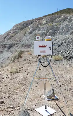 A Wireline extensometer monitoring slope displacement and transmitting data remotely via radio or Wi-Fi. In situ or strategically deployed extensometers may be used to provide early warning of a potential landslide.[55]