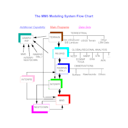 There are many pieces of the MM5 modeling system, each with different functions. These pieces include: TERRAIN, REGRID, LITTLE_R, NESTDOWN, INTERPF, INTERPB, and GRAPH/RIP. In the basic sense, the model begins by taking the information and then makes a model of the land. This is done by using the piece TERRAIN.[7] Then, the model guesses the different pressures that exist in the atmosphere throughout this plot of land, which is done through REGRID.[7] Then, the model takes these guesses, and with the help of some surface observations, can create an objective analysis, using LITTLE_R.[8] RAWINS is an older version of LITTLE_R and thus LITTLE_R is more commonly used. Then INTERPF takes that data from RAWINS/LITTLE_R and REGRID to interpolate that data to the sigma coordinate explained above.[7] MM5 itself computes the time combination. The NESTDOWN function has the ability to change the vertical sigma levels. INTERPB generates the first guess for RAWINS, as well as gathers the files used to make guesses for REGRID. Finally, GRAPH/RIP generates the plots that users can view from all of the data given from the other programs.[7] RIP stands for Read/Interpolate/Plot, and it uses NCAR Graphics to help envisage the output from the MM5.[9]