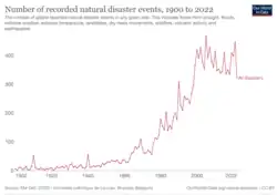 Nowadays it is hard to distinguish between "natural" and "human-made" disasters.[3][7][8] The term "natural disaster" was already challenged in 1976.[6] Human choices in architecture,[9] fire risk,[10][11] and resource management[12] can cause or worsen natural disasters. Climate change also affects how often disasters due to extreme weather hazards happen. These "climate hazards" are floods, heat waves, wildfires, tropical cyclones, and the like.[13]