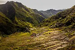 The Banaue Rice Terraces are an example of paddy fields in the country. They are located in Banaue in Northern Luzon, Philippines and were built by the Ifugaos 2,000 years ago.[45] Streams and springs found in the mountains were tapped and channeled into irrigation canals that run downhill through the rice terraces. Other notable Philippine paddy fields are the Batad Rice Terraces, the Bangaan Rice Terraces, the Mayoyao Rice Terraces and the Hapao Rice Terraces.[46]