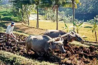 Fields can be built into steep hillsides as terraces or adjacent to depressed or steeply sloped features such as rivers or marshes. They require a great deal of labor and materials to create and need large quantities of water for irrigation. Oxen and water buffalo, adapted for life in wetlands, are important working animals used extensively in paddy field farming.