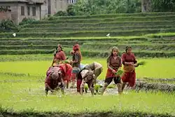 In Nepal, rice (Nepali: धान, Dhaan) is grown in the Terai and hilly regions. It is mainly grown during the summer monsoon in Nepal.[44]
