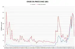 The first commercial oil well in Canada became operational in 1858 at Oil Springs, Ontario (then Canada West).[39] Businessman James Miller Williams dug several wells between 1855 and 1858 before discovering a rich reserve of oil four metres below ground.[40] Williams extracted 1.5 million litres of crude oil by 1860, refining much of it into kerosene lamp oil. Williams's well became commercially viable a year before Drake's Pennsylvania operation and could be argued to be the first commercial oil well in North America.[41] The discovery at Oil Springs touched off an oil boom which brought hundreds of speculators and workers to the area. Advances in drilling continued into 1862 when local driller Shaw reached a depth of 62 metres using the spring-pole drilling method.[42] On January 16, 1862, after an explosion of natural gas, Canada's first oil gusher came into production, shooting into the air at a recorded rate of 480 cubic metres (3,000 bbl) per day.[43] By the end of the 19th century the Russian Empire, particularly the Branobel company in Azerbaijan, had taken the lead in production.[44]