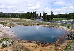 Black Opal Spring in Yellowstone National Park in the United States. Yellowstone, the world's second official protected area (after Mongolia's Bogd Khan Mountain), was declared a protected area in 1872,[30] and it encompasses areas which are classified as both a National Park (Category II) and a Habitat Management Area (Category IV).[31]