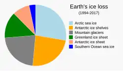 Earth lost 28 trillion tonnes of ice between 1994 and 2017, with melting grounded ice (ice sheets and glaciers) raising the global sea level by 34.6 ±3.1 mm.[8] The rate of ice loss has risen by 57% since the 1990s−from 0.8 to 1.2 trillion tonnes per year.[8]