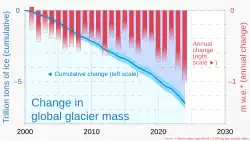 Globally, the mass of glaciers has persistently declined 9 (blue line), with the rate of decline increasing in recent years (red bars).[9]