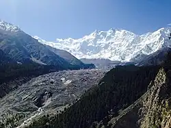 In the Wakhan Corridor of Afghanistan 28 of 30 glaciers examined retreated significantly between 1976 and 2003, with an average retreat of 11 m (36 ft) per year.[76] One of these glaciers, the Zemestan Glacier, retreated 460 m (1,510 ft) during this period, not quite 10% of its 5.2 km (3.2 mi) length.[77] In examining 612 glaciers in China between 1950 and 1970, 53% of the glaciers studied were retreating. After 1990, 95% of these glaciers were measured to be retreating, indicating that retreat of these glaciers was becoming more widespread.[78] Glaciers in the Mount Everest region of the Himalayas are all in a state of retreat. The Rongbuk Glacier, draining the north side of Mount Everest into Tibet, has been retreating 20 m (66 ft) per year. In the Khumbu region of Nepal along the front of the main Himalaya of 15 glaciers examined from 1976 to 2007 all retreated significantly and the average retreat was 28 m (92 ft) per year.[79] The most famous of these, the Khumbu Glacier, retreated at a rate of 18 m (59 ft) per year from 1976 to 2007.[79] In India, the Gangotri Glacier retreated 1,147 m (3,763 ft) between 1936 and 1996 with 850 m (2,790 ft) of that retreat occurring in the last 25 years of the 20th century.[80][81] However, the glacier is still over 30 km (19 mi) long.[81] In Sikkim, 26 glaciers examined between 1976 and 2005 were retreating at an average rate of 13.02 m (42.7 ft) per year.[82] Overall, glaciers in the Greater Himalayan region that have been studied are retreating an average of between 18 and 20 m (59 and 66 ft) annually.[83] The only region in the Greater Himalaya that has seen glacial advances is in the Karakoram Range and only in the highest elevation glaciers, but this has been attributed possibly increased precipitation as well as to the correlating glacial surges, where the glacier tongue advances due to pressure build up from snow and ice accumulation further up the glacier. Between 1997 and 2001, 68 km (42 mi) long Biafo Glacier thickened 10 to 25 m (33 to 82 ft) mid-glacier, however it did not advance.[84]
