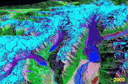 Retreat of San Rafael Glacier from 1990 to 2000. San Quintín Glacier is shown in the background.