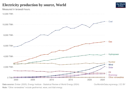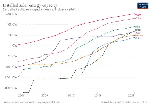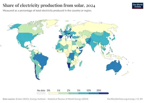 In 2024, solar power generated 6.9% (2,132 TWh) of global electricity and over 1% of primary energy, adding twice as much new electricity as coal.[3][4] Along with onshore wind power, utility-scale solar is the source with the cheapest levelised cost of electricity for new installations in most countries.[5][6] As of 2023, 33 countries generated more than a tenth of their electricity from solar, with China making up more than half of solar growth.[7] Almost half the solar power installed in 2022 was mounted on rooftops.[8]