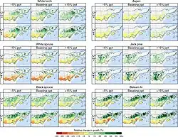 A 2021 paper had confirmed that the boreal forests are much more strongly affected by climate change than the other forest types in Canada and projected that most of the eastern Canadian boreal forests would reach a tipping point around 2080 under the RCP 8.5 scenario, which represents the largest potential increase in anthropogenic emissions.[114] Another 2021 study projected that under the moderate SSP2-4.5 scenario, boreal forests would experience a 15% worldwide increase in biomass by the end of the century, but this would be more than offset by the 41% biomass decline in the tropics.[115] In 2022, the results of a 5-year warming experiment in North America had shown that the juveniles of tree species which currently dominate the southern margins of the boreal forests fare the worst in response to even 1.5 °C (2.7 °F) or 3.1 °C (5.6 °F) of warming and the associated reductions in precipitation. While the temperate species which would benefit from such conditions are also present in the southern boreal forests, they are both rare and have slower growth rates.[116]