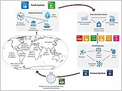 Map showing global and regional tipping elements: if the global temperature increases past a certain point (color-coded for temperature thresholds), this particular element would be tipped.[1] The result would be a transition to a different state.[2]