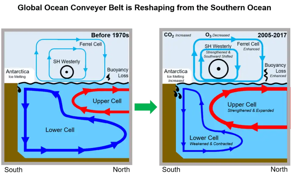 Southern ocean overturning circulation itself consists of two parts, the upper and the lower cell. The smaller upper cell is most strongly affected by winds due to its proximity to the surface, while the behaviour of the larger lower cell is defined by the temperature and salinity of Antarctic bottom water.[85] The strength of both halves had undergone substantial changes in the recent decades: the flow of the upper cell has increased by 50–60% since 1970s, while the lower cell has weakened by 10–20%.[86][87] Some of this has been due to the natural cycle of Interdecadal Pacific Oscillation,[88][89] but climate change has also played a substantial role in both trends, as it had altered the Southern Annular Mode weather pattern,[90][88] while the massive growth of ocean heat content in the Southern Ocean[91] has increased the melting of the Antarctic ice sheets, and this fresh meltwater dilutes salty Antarctic bottom water.[92][93]