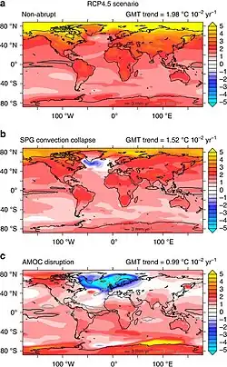 Some climate models indicate that the deep convection in Labrador-Irminger Seas could collapse under certain global warming scenarios, which would then collapse the entire circulation in the North subpolar gyre. It is considered unlikely to recover even if the temperature is returned to a lower level, making it an example of a climate tipping point. This would result in rapid cooling, with implications for economic sectors, agriculture industry, water resources and energy management in Western Europe and the East Coast of the United States.[80] Frajka-Williams et al. 2017 pointed out that recent changes in cooling of the subpolar gyre, warm temperatures in the subtropics and cool anomalies over the tropics, increased the spatial distribution of meridional gradient in sea surface temperatures, which is not captured by the AMO Index.[81]