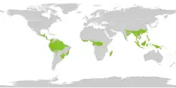 In biogeography, the tropics are divided into Paleotropics (Africa, Asia and Australia) and Neotropics (Caribbean, Central America, and South America). Together, they are sometimes referred to as the Pantropic. The system of biogeographic realms differs somewhat; the Neotropical realm includes both the Neotropics and temperate South America, and the Paleotropics correspond to the Afrotropical, Indomalayan, Oceanian, and tropical Australasian realms.