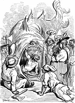 The word "whale" comes from the Old English hwæl, from Proto-Germanic *hwalaz, from Proto-Indo-European *(s)kwal-o-, meaning "large sea fish".[3][4] The Proto-Germanic *hwalaz is also the source of Old Saxon hwal, Old Norse hvalr, hvalfiskr, Swedish val, Middle Dutch wal, walvisc, Dutch walvis, Old High German wal, and German Wal.[3] Other archaic English forms include wal, wale, whal, whalle, whaille, wheal, etc.[5]